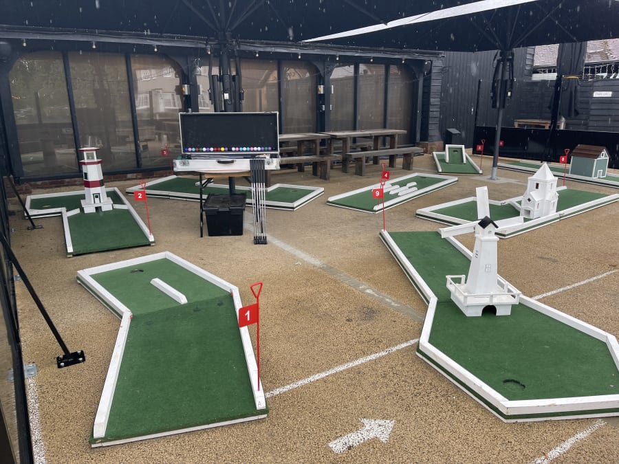 Our 9 hole crazy golf course is packed with whimsical and challenging obstacles that will keep players engaged and entertained. From navigating through a windmill, to conquering a lighthouse, and even putting your way through a bridge and a church, each hole offers a unique and exciting experience.