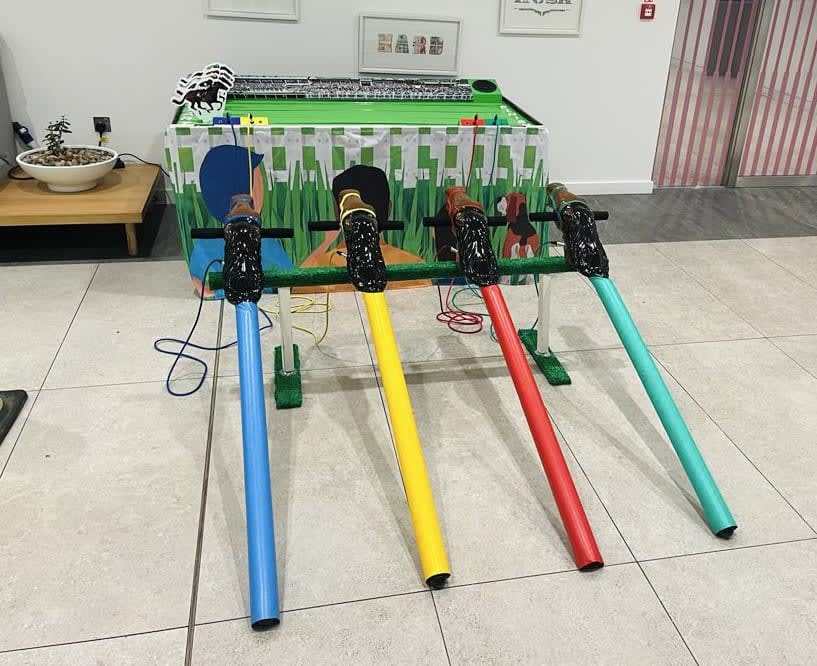 Players mount the hobby horse and grip the handles. When the horn sounds, they gallop on the spot. Motion sensors move each player’s marker along the race track. First across the line wins. Simple. Fast. Addictive. ⚡️