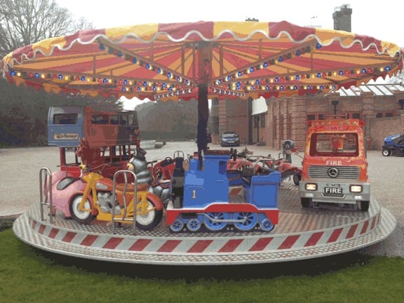The Toyset is a popular eye catching fairground ride. It has a range of toys to sit on and ride, including a bus and a fire engine. its great for a range of ages.